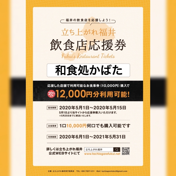 5/1〜5/15までの期間【和食処かばた】のお食事応援券が立ち上がれ福井より購入できます😭✨一口10...